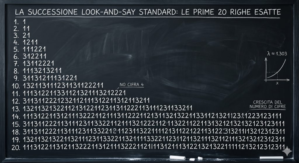 Nota curiosa: In tutta questa infinita cascata di numeri, non apparirà mai la cifra 4. È stato dimostrato che se si inizia con una stringa che non contiene cifre superiori a 3, nessun numero della sequenza conterrà mai un 4 o superiore. È un ecosistema chiuso fatto solo di 1, 2 e 3.