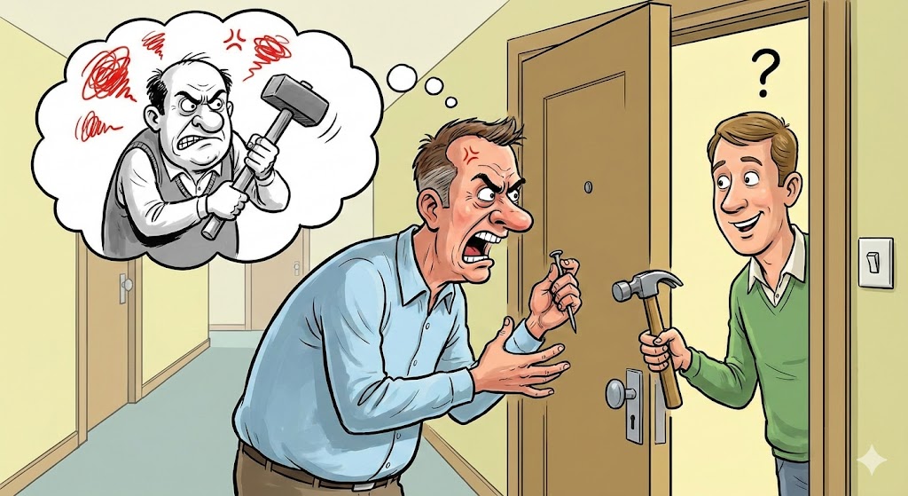 L’uomo è ormai furioso, il battito cardiaco accelerato, convinto di aver subito un torto gravissimo. Arriva alla porta, suona il campanello. Il vicino apre subito, con un bel sorriso stampato in faccia: “Buongiorno! In cosa posso esserle util…” Prima che possa finire la frase, l’uomo gli urla in faccia paonazzo: “TIENITELO IL TUO SCHIFOSO MARTELLO, VILLANO!”
