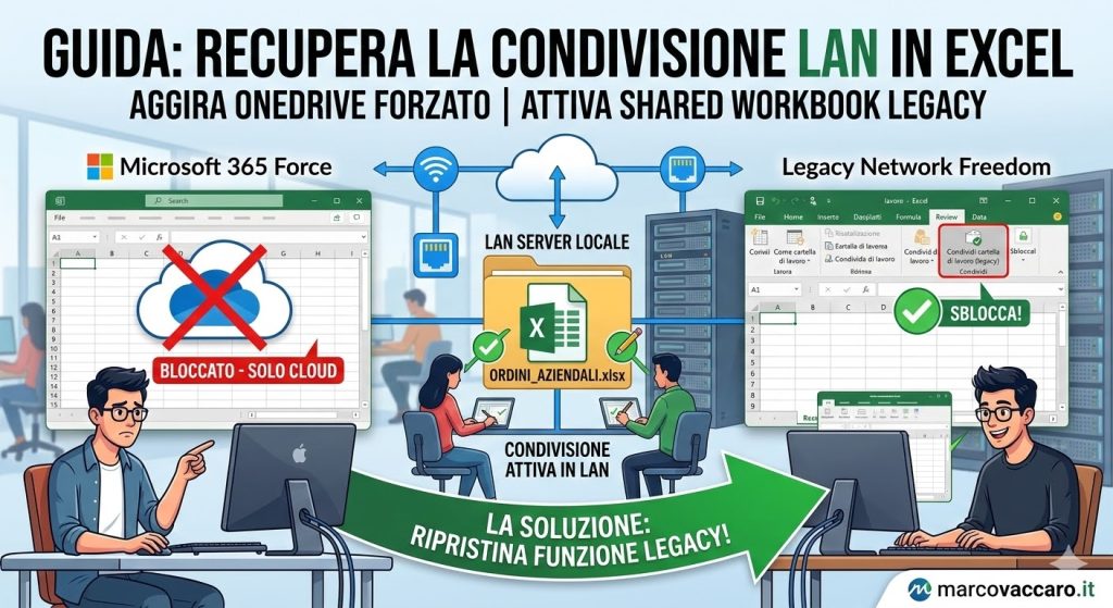 Da oggi, quando apri un file di rete che vuoi condividere con i colleghi, ti basterà cliccare su quell’icona, mettere la spunta su “Usa la funzionalità legacy di condivisione cartelle di lavoro” e salvare. Avrai riavuto indietro il tuo salvataggio a incrocio intelligente, sfruttando la tua rete locale, a costo zero. Alla faccia del noleggio obbligatorio.